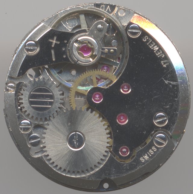 This movement uses an excentrical located minute wheel (on the movement side at “5”, on the dial side at “7”), which drives the hands indirectly. This kind of construction allows larger balances and mainsprings on smaller movements, which influence the daily rates and run time in a positive way.