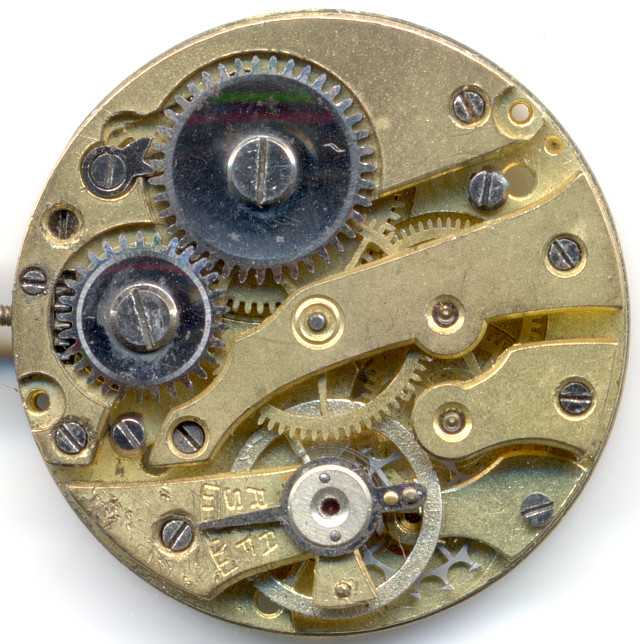 The AS 568 uses the standard gear train for a cylinder movement: Mainspring barrel, directly driven center minute wheel, third wheel, fourth wheel and finally the cylinder wheel.