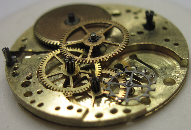 The gear train is absolutely typical for a cylinder movement with decentral second at 6 o’clock: Mainspring barrel - minute wheel - third wheel- large seconds wheel - cylinder wheel. Except for the cylinder wheel, all gears are beared under one single bridge, of which the bearings are just simple holes, no rubies. It’s pretty hard to insert all the gears simultaneously.
