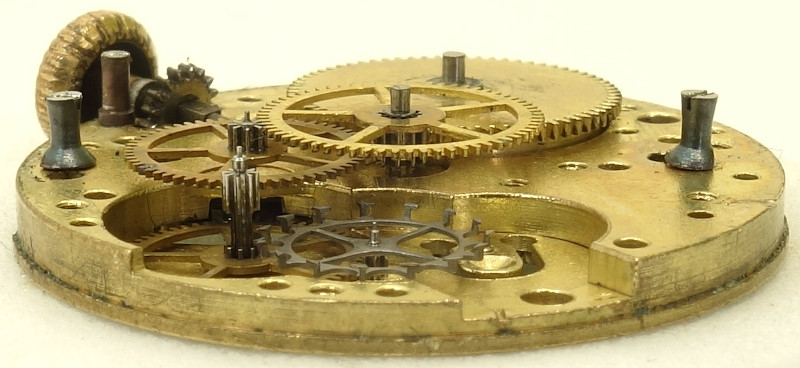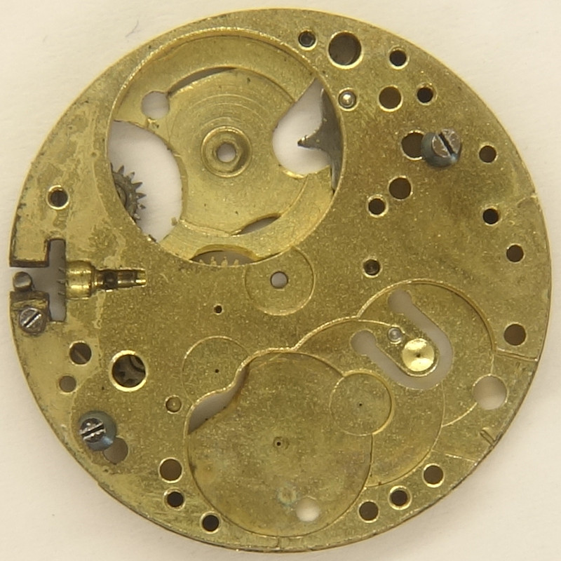 This cylinder movement, probably from the 1920s, has got a diameter of 9 3/4 lignes. Although the shape of its three-quarter bridge is pretty unique and although parts of the movement number can be seen on the dial side, it cannot be identified.