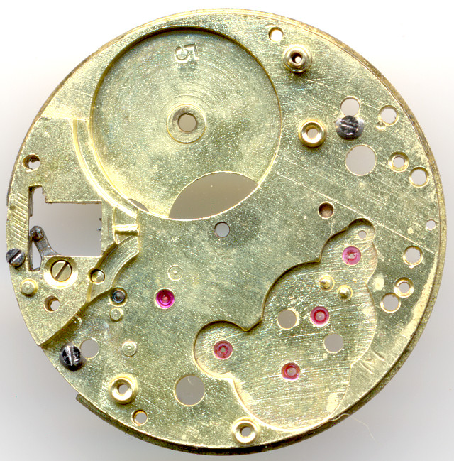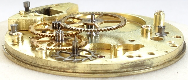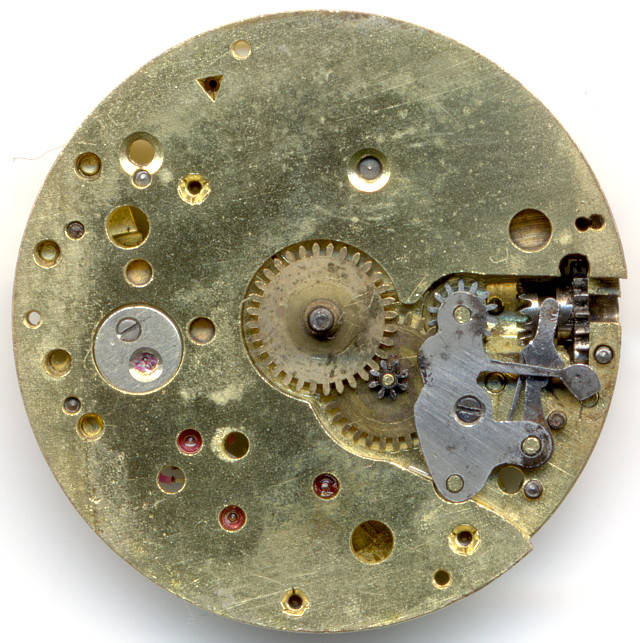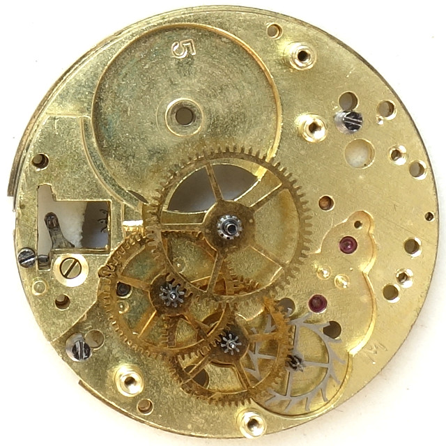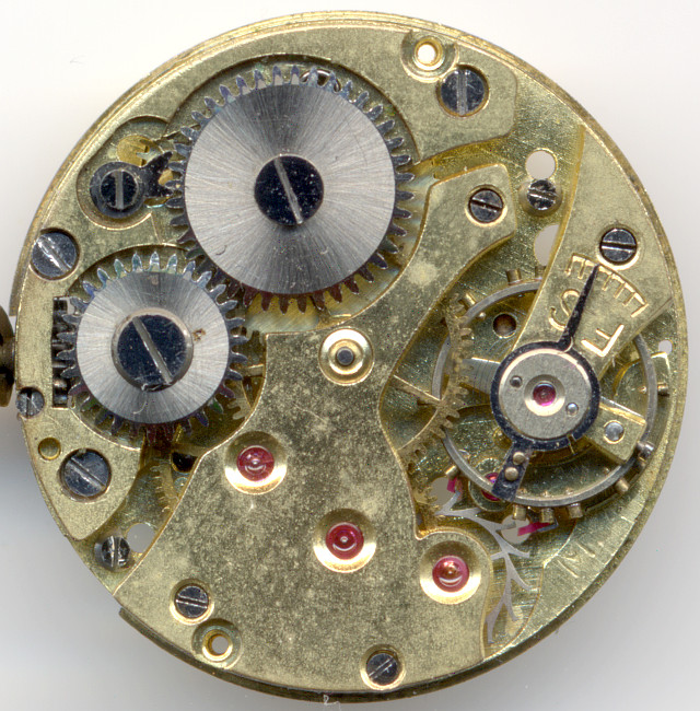 You can see the state of the art of that time: Brass/gilt colored base plate with ruby bearings for all fast turning gears.