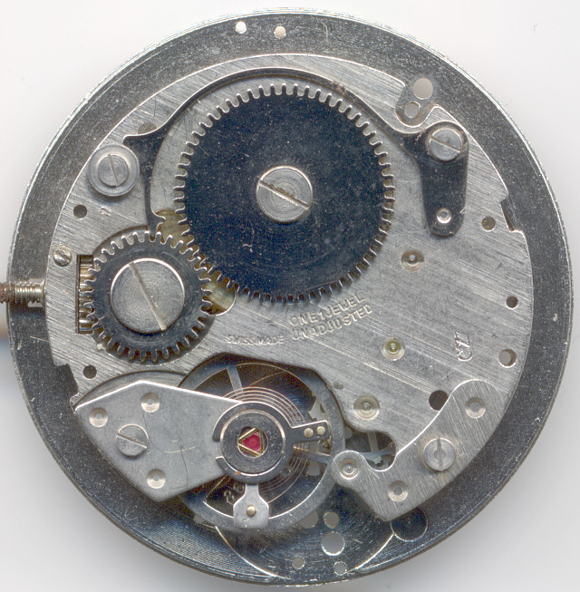 The balance, which is equipped with a large finger, beats slowly with 18000 A/h and is on both ends secured with a Novodiac shock protection system. On the dial side, there’s a oddity: Instead of using a ruby, a metal plate is used. This is only a few cents cheaper, than using a ruby bearing here, but if many thousands of these movements were sold, the price savings were a bit effective.