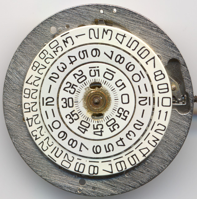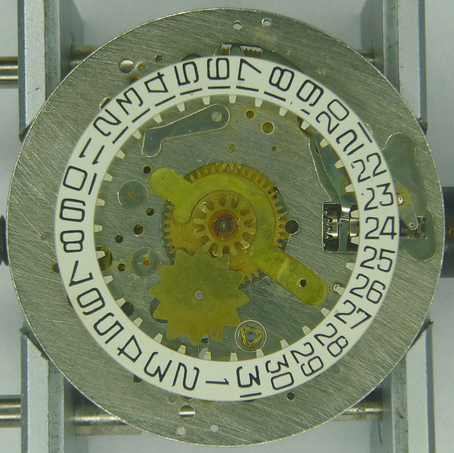 On the dial side, when the date ring is put away, you can see the yoke winding system and the two gears on top of the mainspring barrel, which drive the hour and minute wheels at the center of the movement.