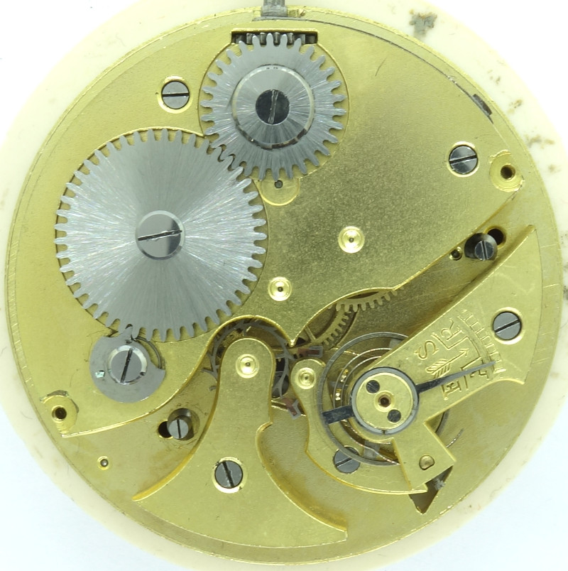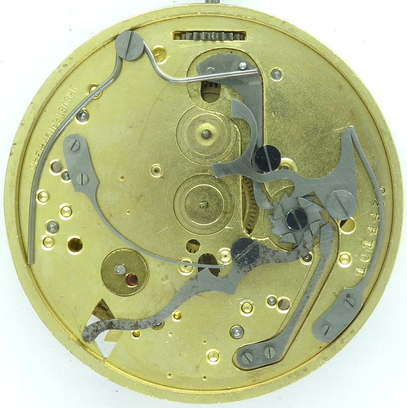 Unfortunately, this 18 1/2 ligne stopwatch caliber is unmarked, but with a very high certaincy it originates from the swiss manufacturer Berna Watch SA from St. Imier, not least beause of its marked swiss patent number 74234 , which relates to starting and blocking the balance wheel.