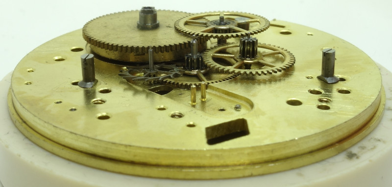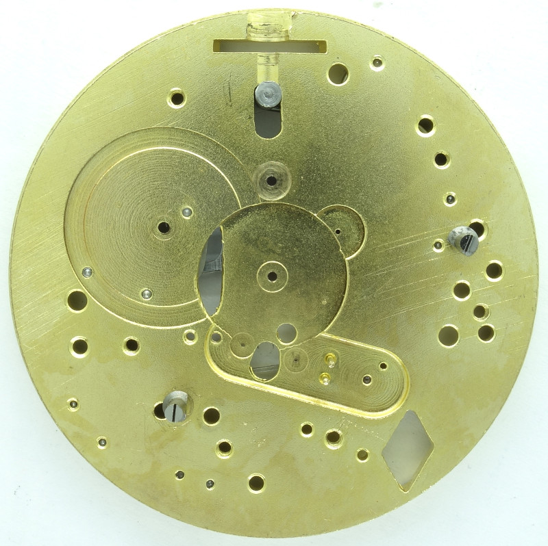 The mainspring barrel drives the decentral seconds(!) wheel at 12 o’clock, which makes one turn every 90 seconds. It is followed by a reduction wheel the central 1/100 seconds wheel, which takes three seconds for a revoltion.