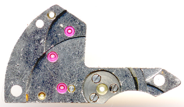 The oscillating weight carries a ruby bearing in its center and an gear, which connects to the upper gear of the rocking bar changer.