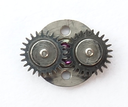 At 7 o’clock you see the rocking bar changer of the selfwinding module. It is a simple construction, consisting of two connected gears. Depending on the direction of the upper wheel, either it, or the lower wheel connects with the first reduction wheel, which is saved by a ratchet against turning in the wrong direction.