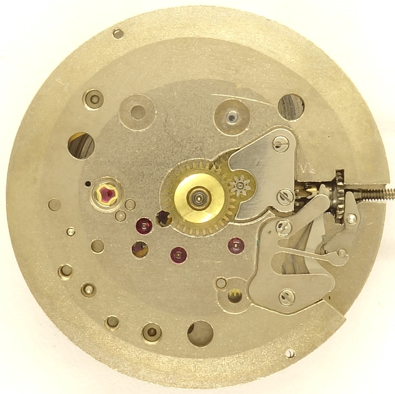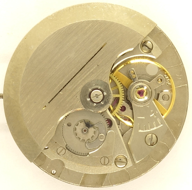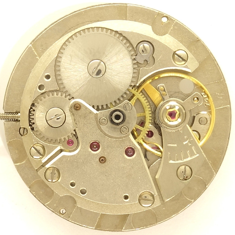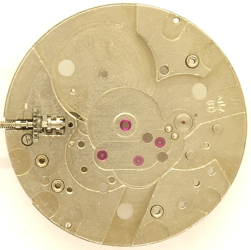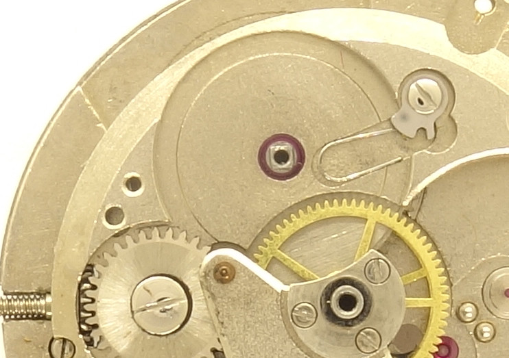 As usual in the 1950s, this movement uses a directly driven center minute wheel, beared under an own cock.