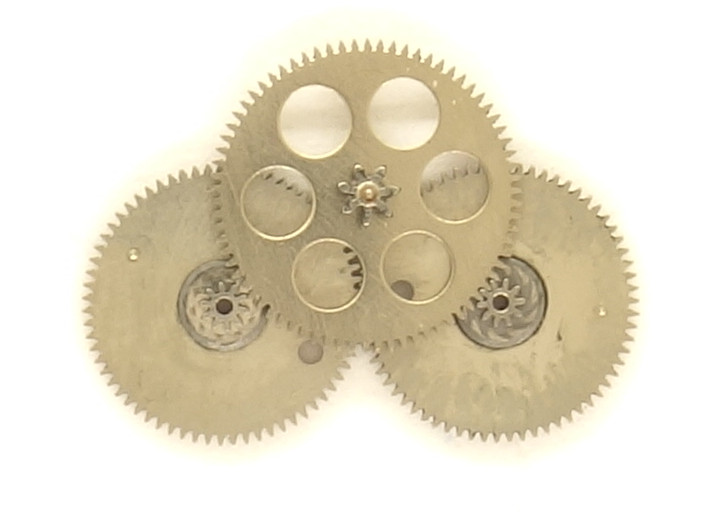 The selfwinding mechanism consists of only three parts, two identical pawl changer gears, whose inner/lower gear engages with the reduction wheel. This meams, both turn their inner part always in the same direction.