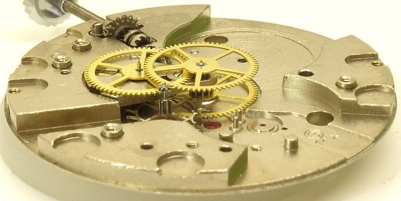 You can see here the two brass bearings for the two pawl changer gears and the ruby bearings for the reduction wheel, which engages with the crown wheel.