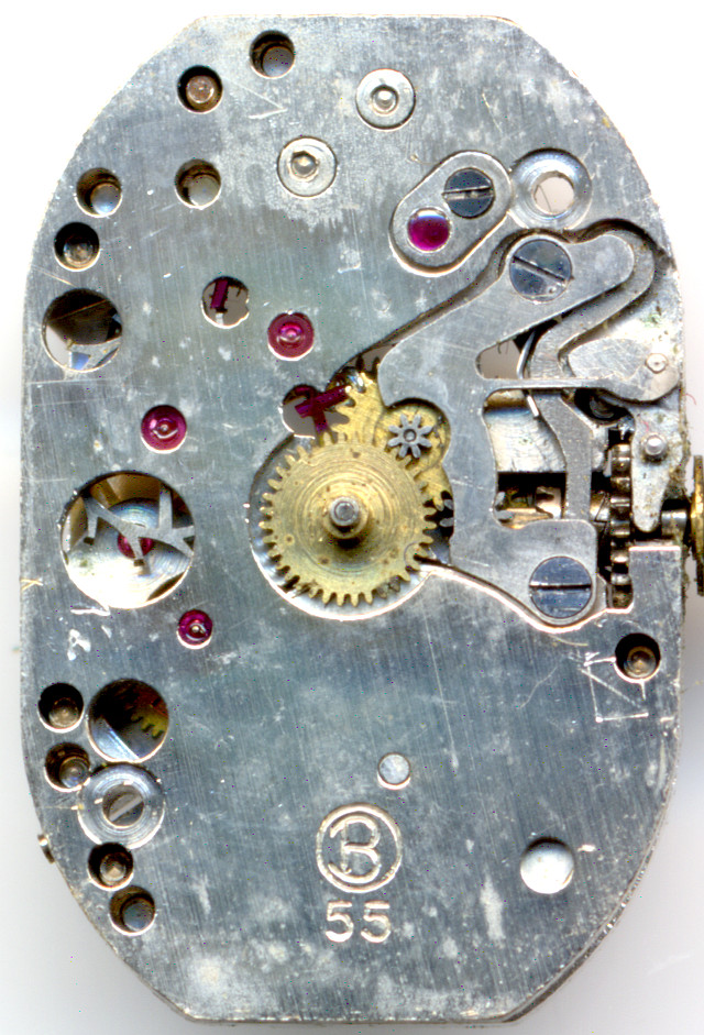 The base plate is massive and has got the typical construction of small form movement where the gears and bearings partially overlap each other.