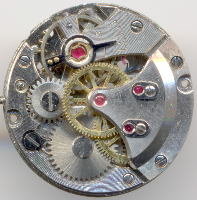 Like the caliber 734, it has got a directly driven center minute wheel, beared below an own cock.