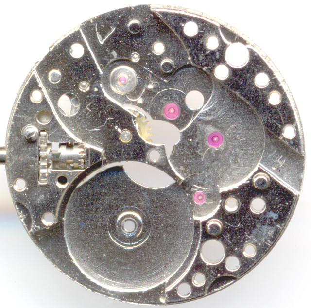 The base plate shows, that all important gears, except the minute wheel, are ruby-beared. The only difference to the caliber 734 is, that the balance wheel is shock protected with two Incabloc bearings. With two additional cap jewels, that’s a a total of 17 jewels.