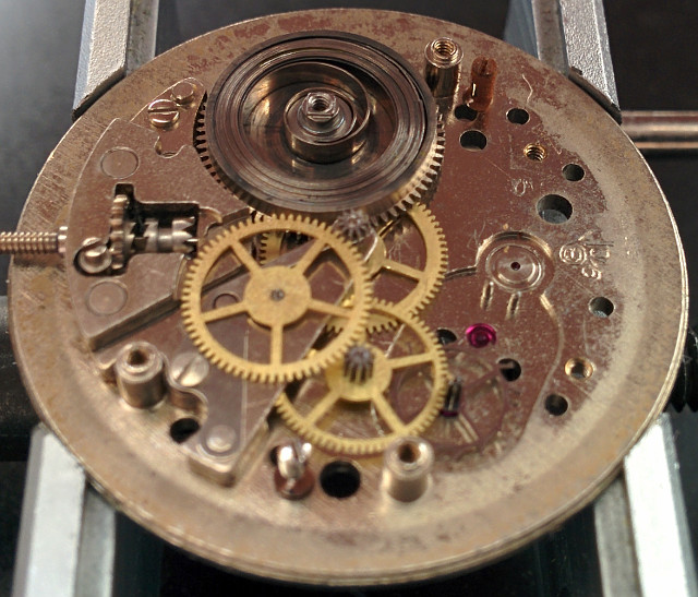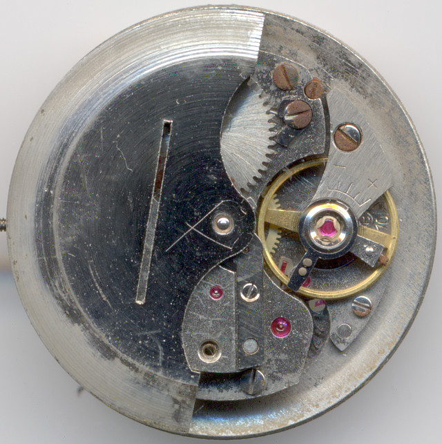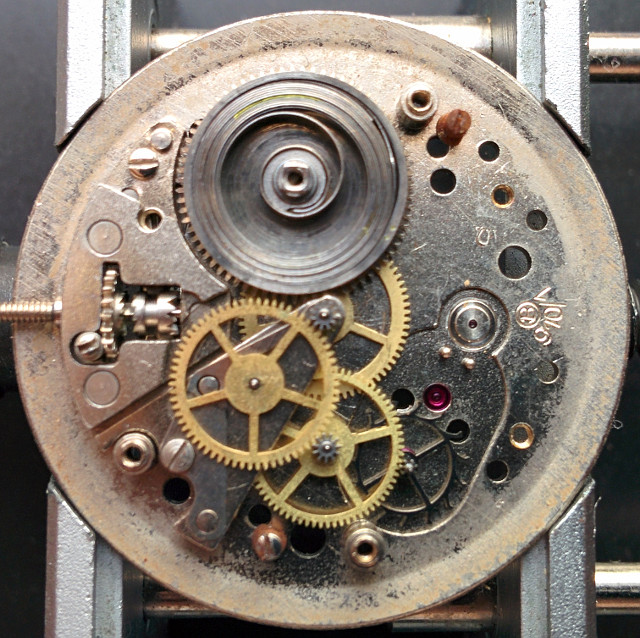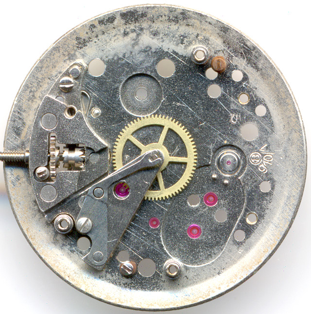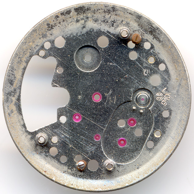 At the main plate, you can see two things: First, that this movement uses plenty of bearing jewels, including the minute wheel, and second, that it is a pillar construction, which was cheaper to produce.
