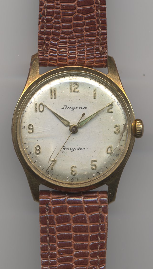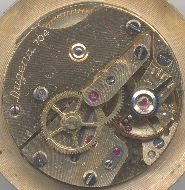The Bifora caliber 934 (SCI), from Dugena also called Dugena 704, is a pallet anchor lever movement with seventeen jewels, indirect driven center second hand and a rocking bar winding mechanism below the dial.