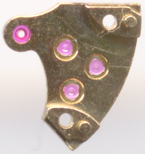 The gear train bridge also contains three chatons with cap jewels, which means, that the escapement wheel is beared in 4 jewels, fourth and third wheel in three jewels.