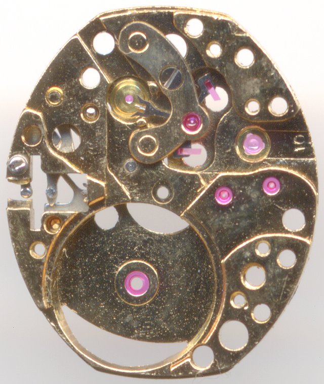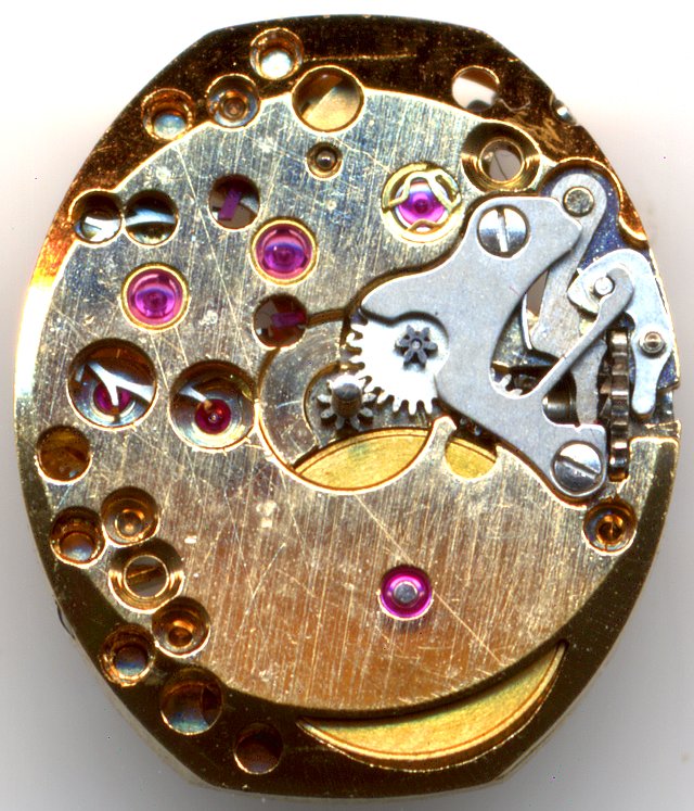 The (almost) empty main plate shows, that the escapement wheel is beared in a chaton with cap jewel, and that additionally, the mainspring barrel is jewel-beared, too. The latter has not go technical advantage, though.