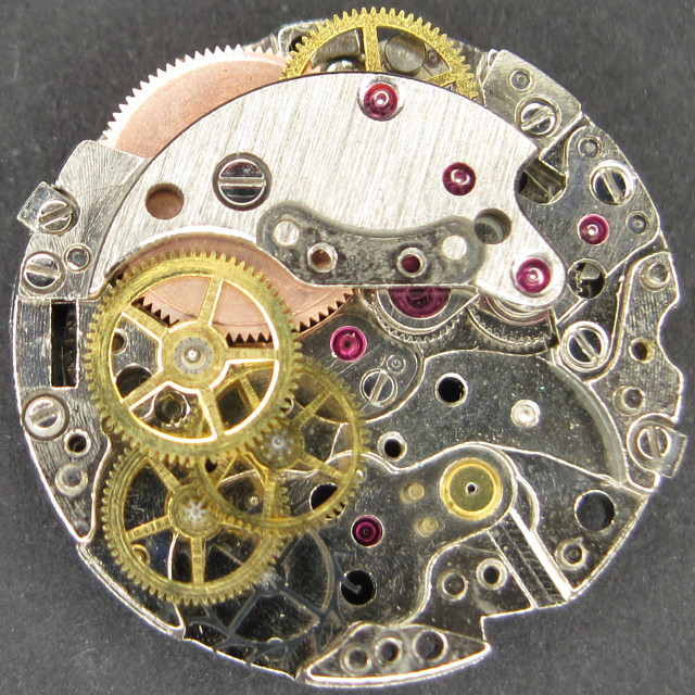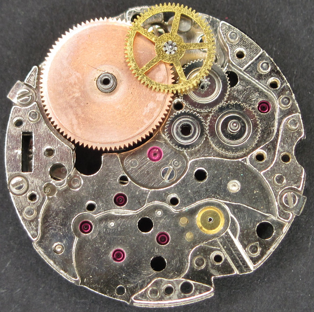At 3 o’clock, you see the cluth drive of the second whee, whose lower side engages with the mainspring barrel. Its upper side drives a changer wheel, which drives the hands.