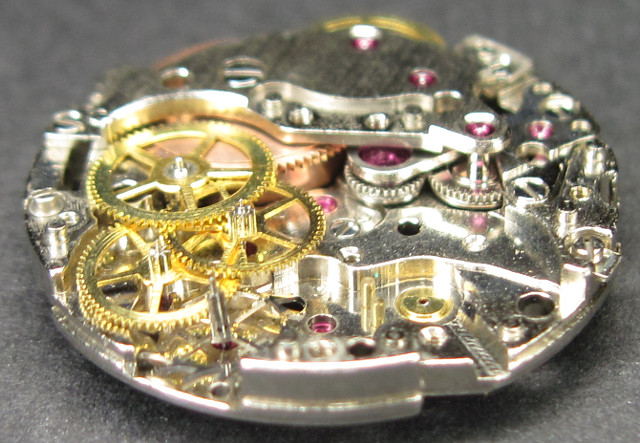 On the base plate, there are no less than 11 ruby bearings, this is easily twice the amount of “normal” movements and of regular selfwinding movements, too. Particularly striking is the large flat ruby, which is the bearing for the floating(!) pinion.