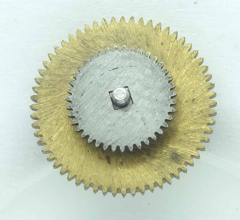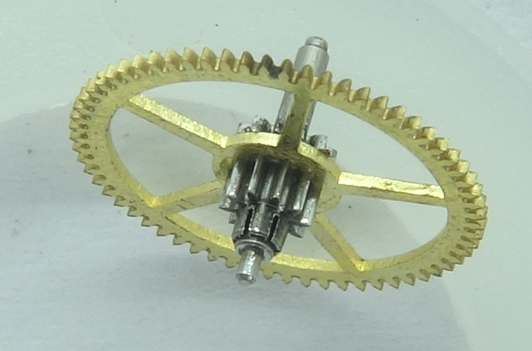 Since the hands settings is done on the movement side, the minute wheel carries a slipping clutch for its lower pinion and axle. The lower pinion engages with the setting wheel. The upper pinion is driven by the mainspring barrel.