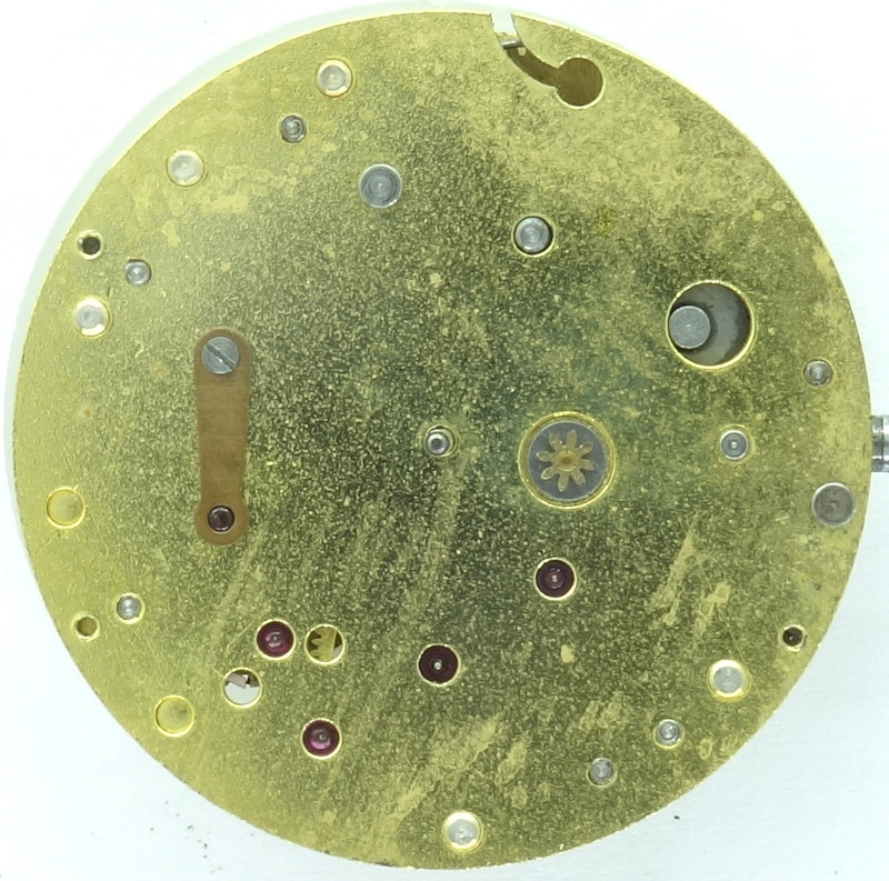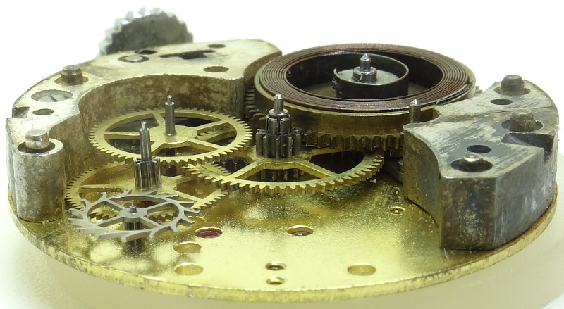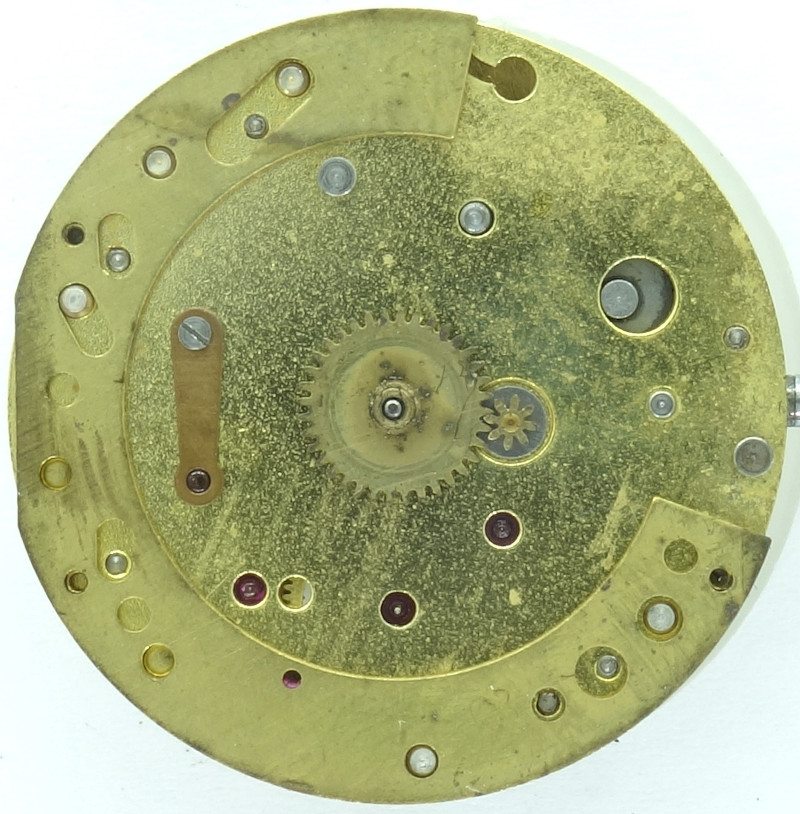 Probably for cost-saving reasons, Buser introduced for their pillar construction Buser 36 this odd construction, where the rocking bar winding system, the ratchet and the setting- and reverse wheel are located on the inner side of the base plate.