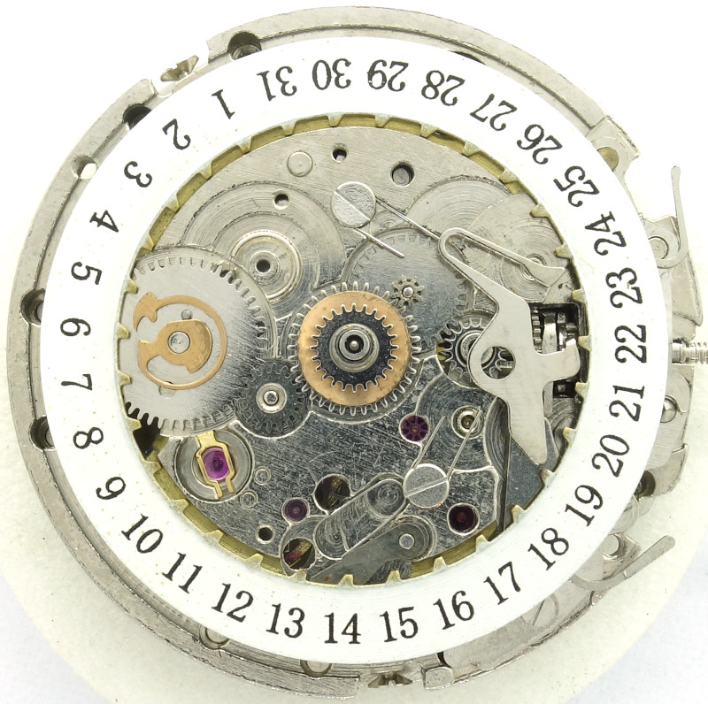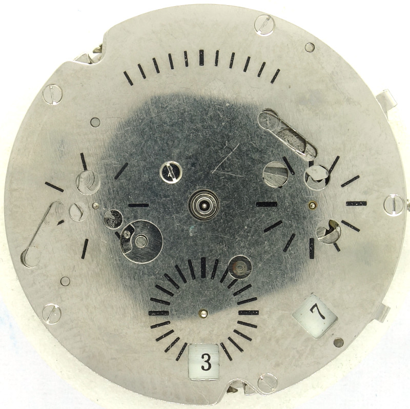 The date mechanism switches slowly, but has got a quickset ability, using the middle crown position. This is achieved by the (in the photo dislocated) lever above the yoke winding mechanism.