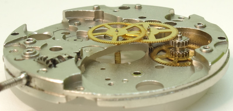 As usual, the canon pinion drives a changer wheel, which is followed by the hour wheel.
