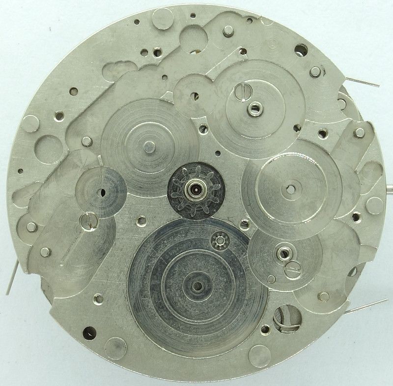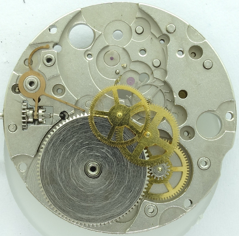 The gear train is made like on ETA movements with an indirectly dial-side driven hand works. For that, the mainspring barrel drives the massive second wheel, followed by the third wheel, whose pinion also drives the hand works on the dia side.