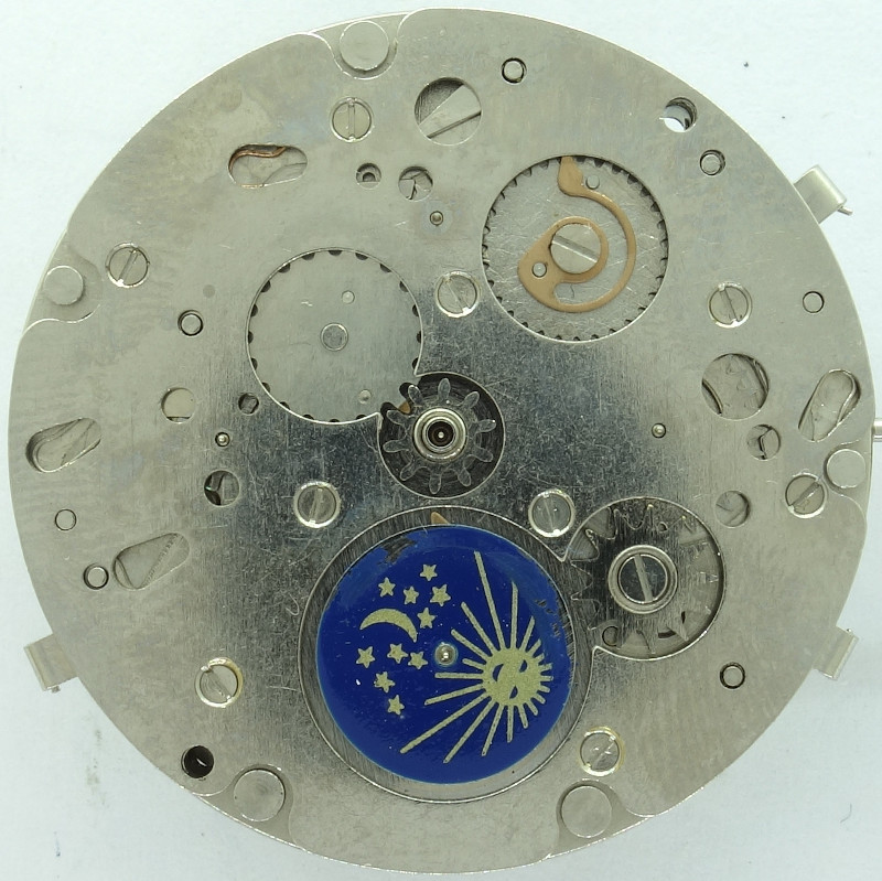 The tiny driving wheel at 5:30 drives the day/night indication at 6 o’clock. A pin is responsible to advance the date pointer at 3 o’clock, and this day indication drives a switching wheel at 1:30 with a moveable pin, which advances the month pointer at position 12 o’clock every 31 days. For months with less than 31 days, a manual correction is required.