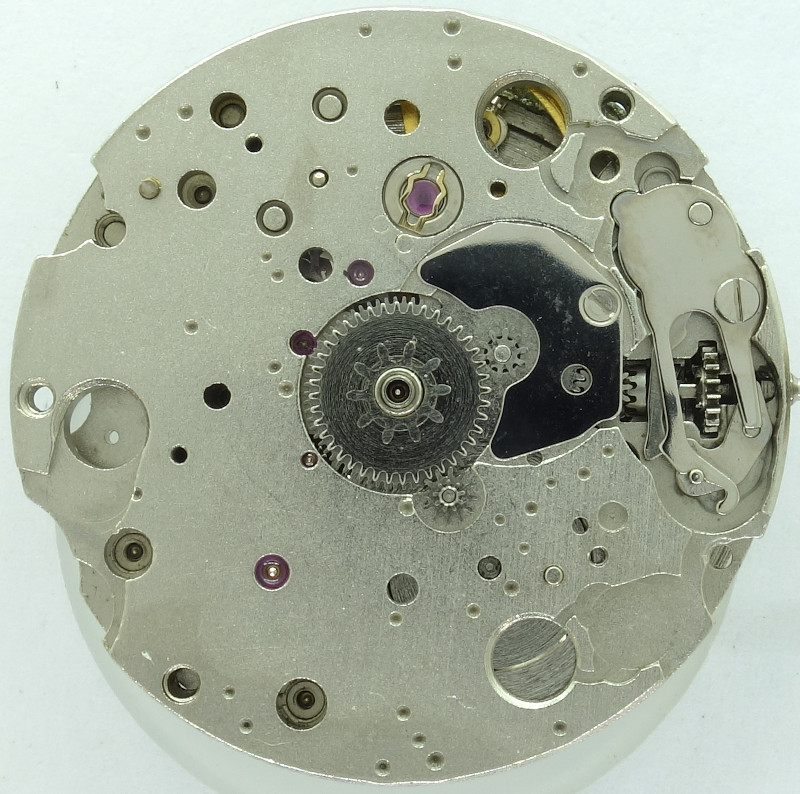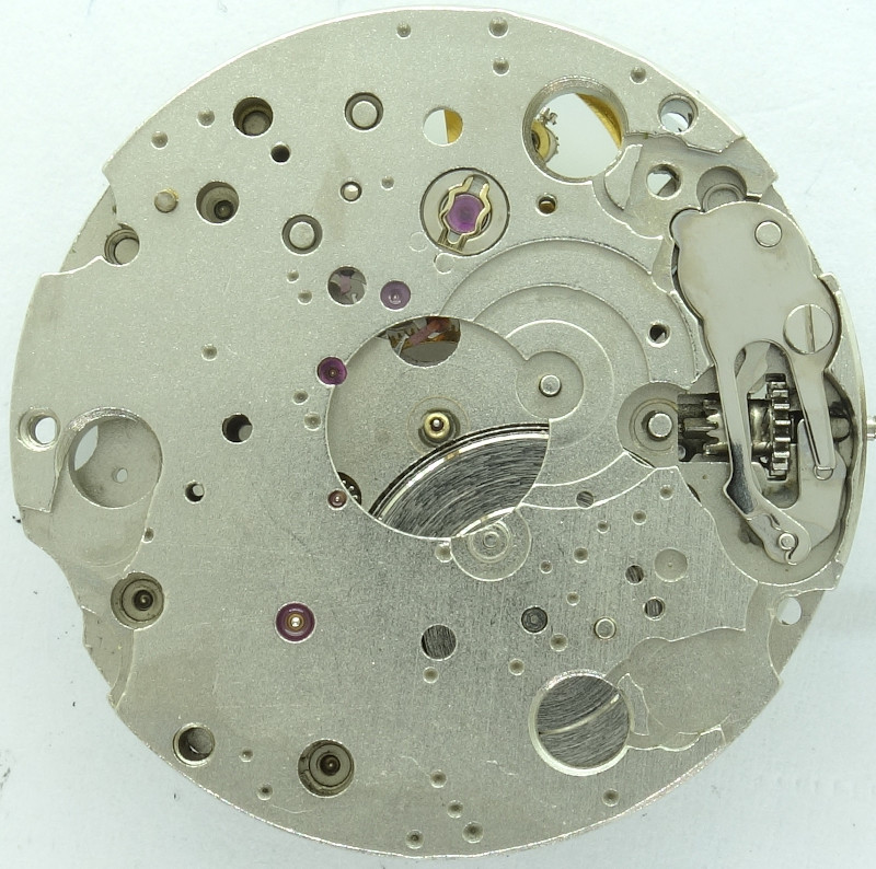 The base plate also reminds a bit of ETA movements due its gear train, and also here, all important bearings contain rubies.