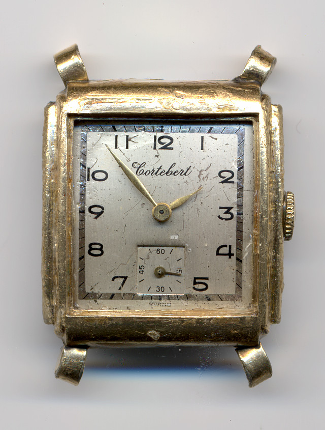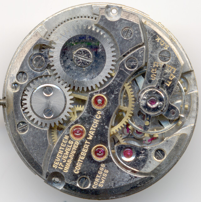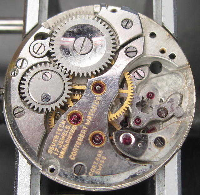 The Cortébert 665 shown here is from a time, when there was yet no need for cutting costs. It’s a 10 1/2 ligne pallet lever movement with decentral seconds indication, originating probably from the 1940ies.