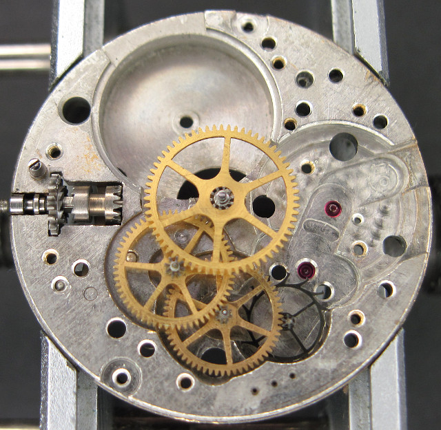 Minute-, third- and fourth wheel are beared under one bridge, the escapment wheel below a own cock. This one is very nicely made with a cap jewel and highly polished large setting. It reminds of expensive pocket watch movements.