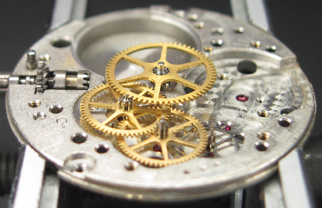 It’s a pity, that the plugged chatons are only used on the movement side, but nevertheless, all bearings are made of high quality rubies. Additionally on the minute wheel with its curved legs, you can see the exceptional quality.