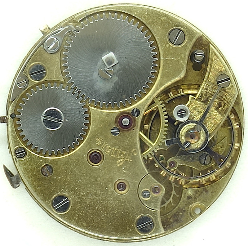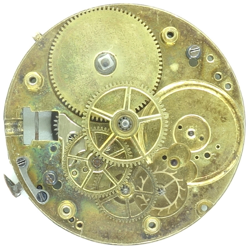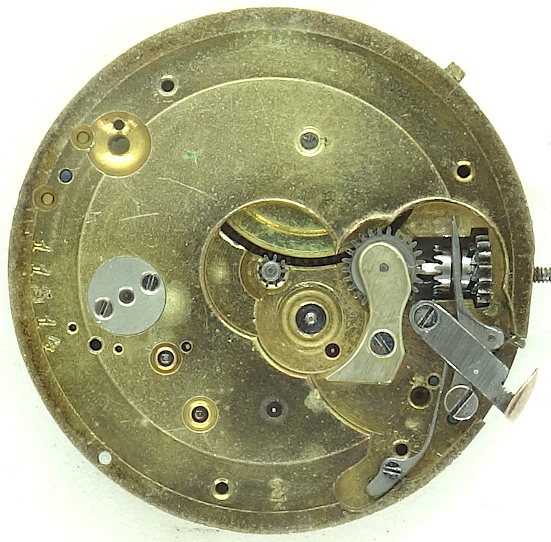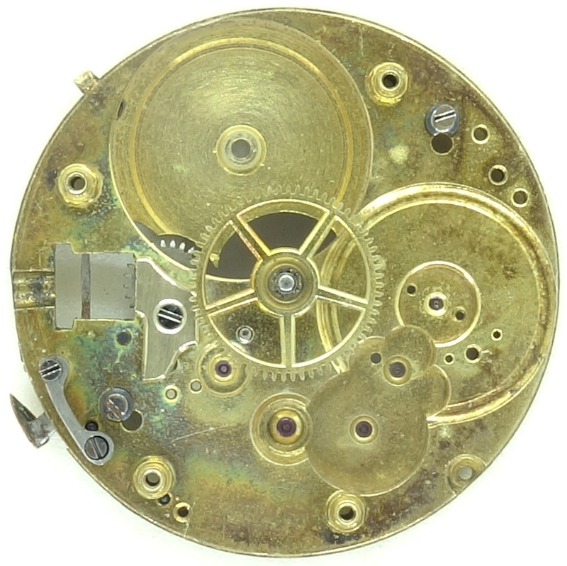 The small diameter of this movement (too small for a normal pocket watch) and the position of the decentral seconds in a 90 degrees angle of the winding stem suggest, that it was used for a small ladies’ pocket watch.
