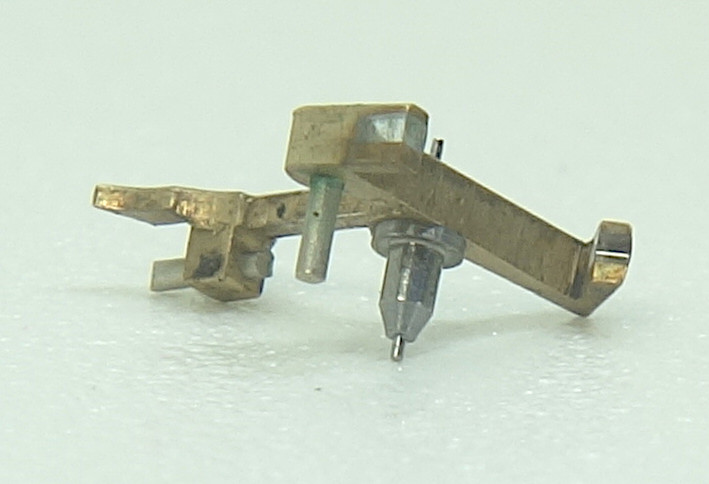 The design of the lever made of gold alloy is quite typical of Glashütte: On the left (through Corrosion covered with verdigris) you can see the mandrel of the lever, through which the maximum deflection is limited.