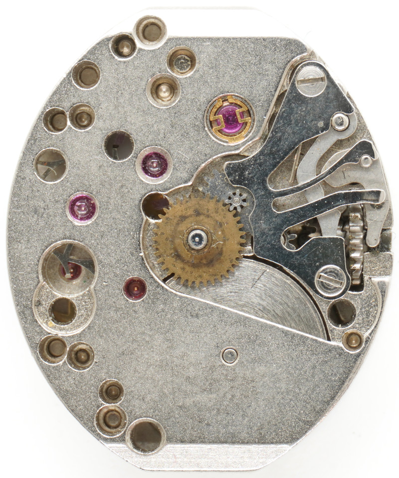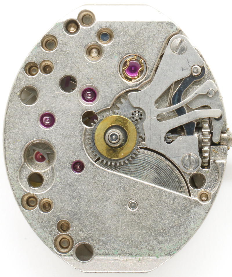 All bearings, except those of the slowly revolving mainspring barrel contain rubies, even the directly driven center minute wheel. On such a tiny movement, it is important to reduce friction as much as possible.