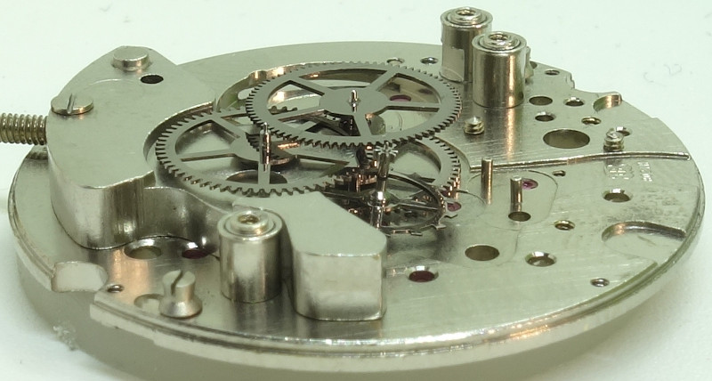 The remaining parts of the gear train could also be found in a pallet lever movement: Minute wheel, third wheel, center seconds wheel and escape wheel.