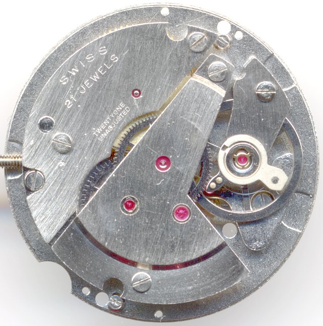 The construction of that movement, which probably originates from the 1960ies is contemporarily modern with a directly driven center second and a minute wheel, which is located under its own bridge.