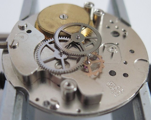 The movement is a so called pier construction, which means, that between the thin main plate and the upper bridges, there are only pillars. This saves a lot of money, but is of course less stable and sturdy.