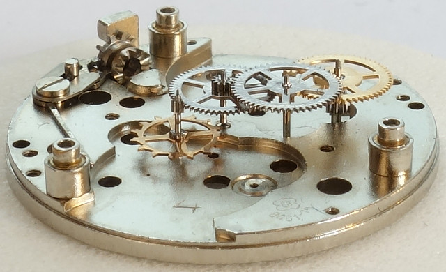 On the EB 8461-74, you see its inheritance from Roskopf movements, since also on this movements, the hands (only the minute wheel) is driven by a loosely coupled third gear on top of the mainspring barrel - the top gear on the photo above.