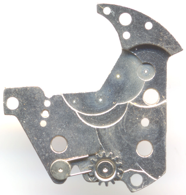 The inner side of the gear train bridge hosts the odd winding click mechanism, which consists only of two parts, a U-shaped spring and a gear. Both are riveted and cannot be replaced.