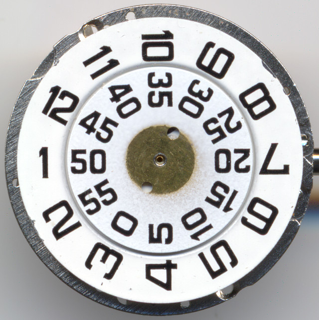 The direct read indication consists of a constantly driven minute disc, on the minute cannon pinion and a hour wheel with 12 teeth on its inner side which is advanced once per hour by the reverser wheel.