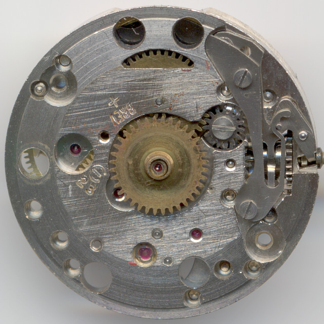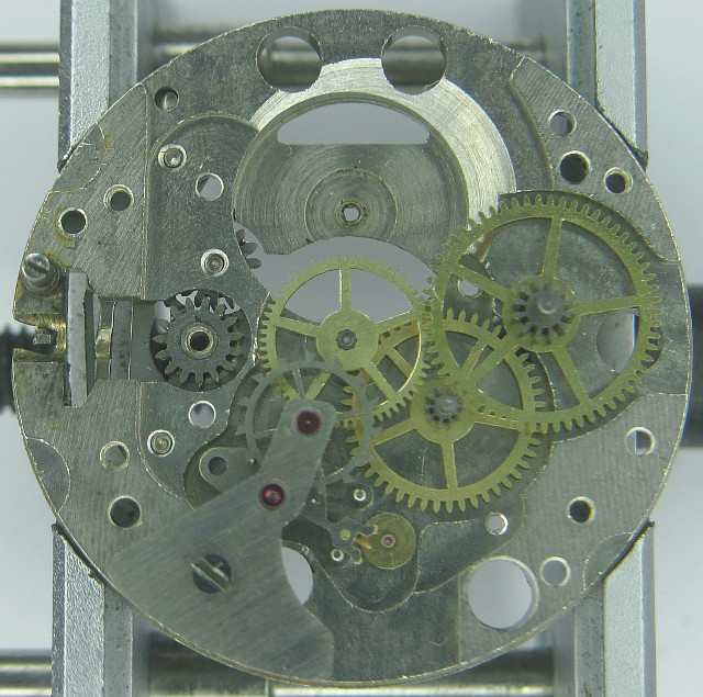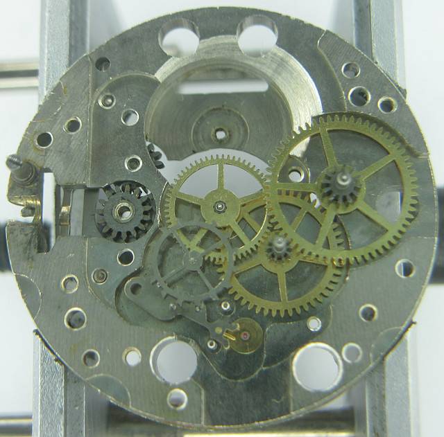 This movement has got an own cock for the center second wheel and (and this is really odd!) a cock, which bears both, the escapement wheel and the lever. This construction makes it impossible for a watch maker to test the complete movement without the lever!