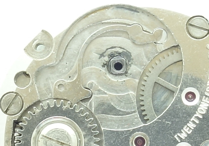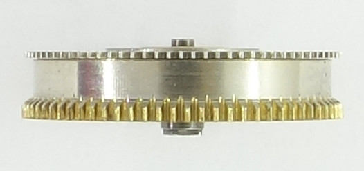 As common on Roskopf movements, the hands setting wheel does not engage with the cannon pinion, but with the top gear of the mainspring barrel, which drives, as described above, the cannon pinion.