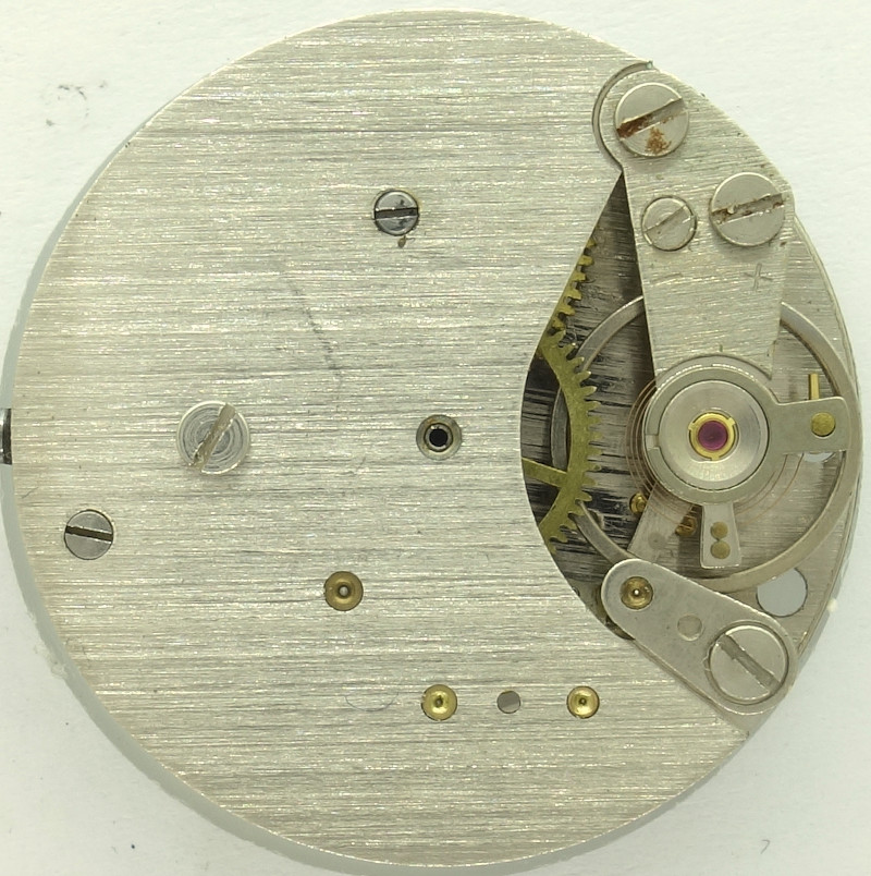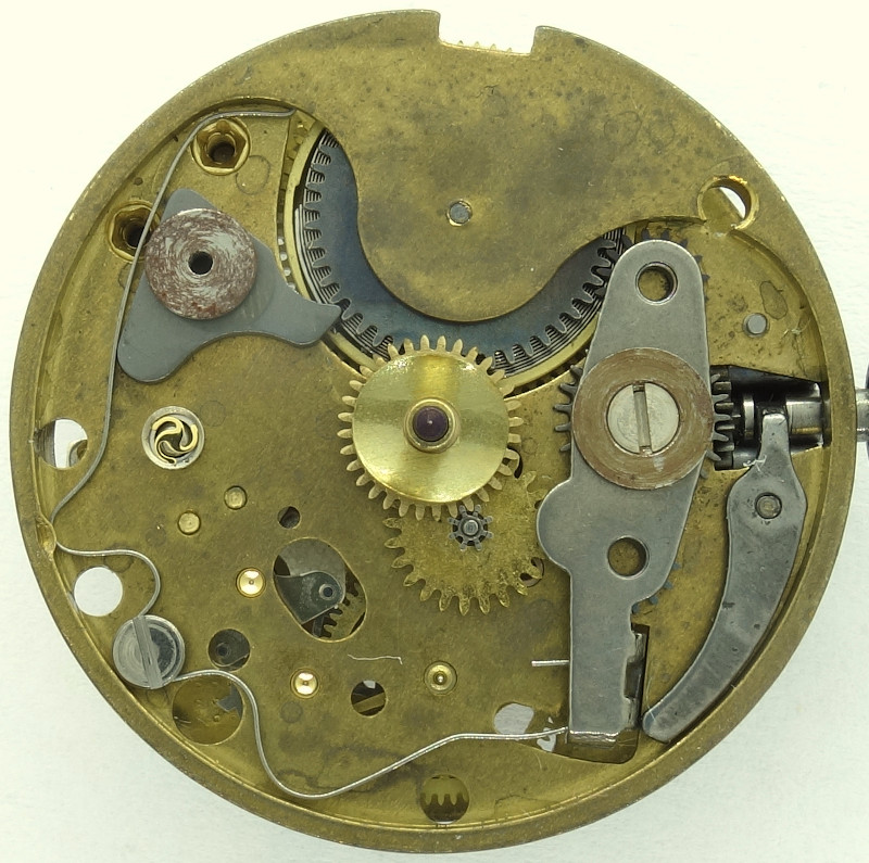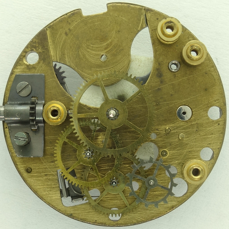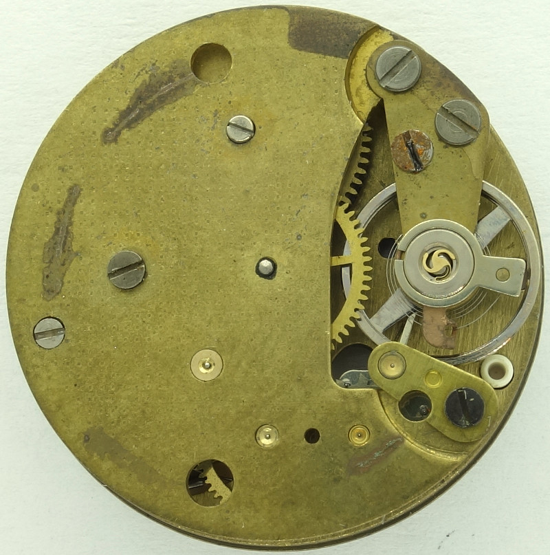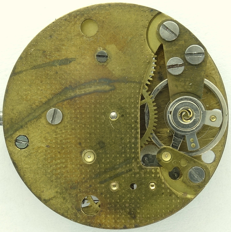 The base plate of this 10 1/2 ligne pillar movement shows, that we have a technically simple, cheap movement, which does not use bearing rubies.