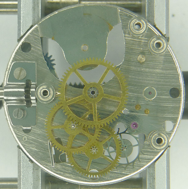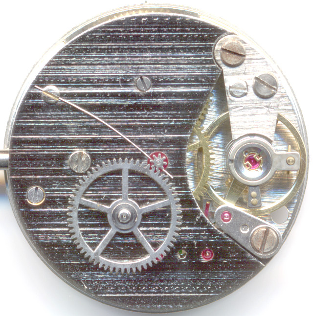Since the minute wheel is double ruby beared (the top, detachable, ruby is also the bearing for the indirectly driven center second, which is only beared on that side, and which is secured a bit by a spring), even without cap jewels, this movement has got 17 jewels.