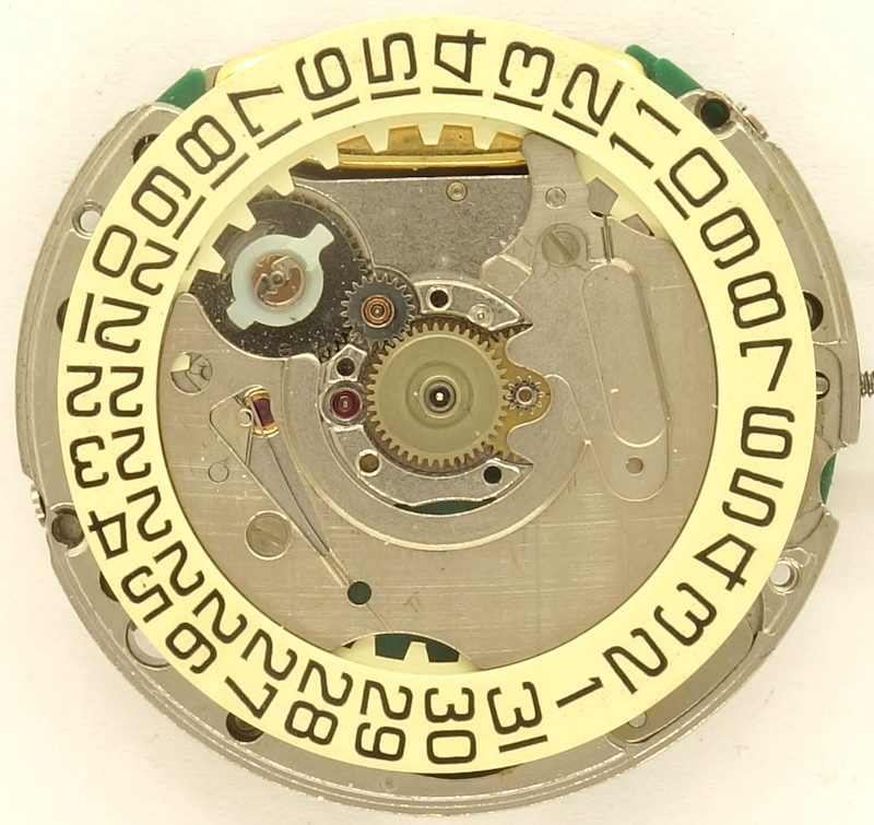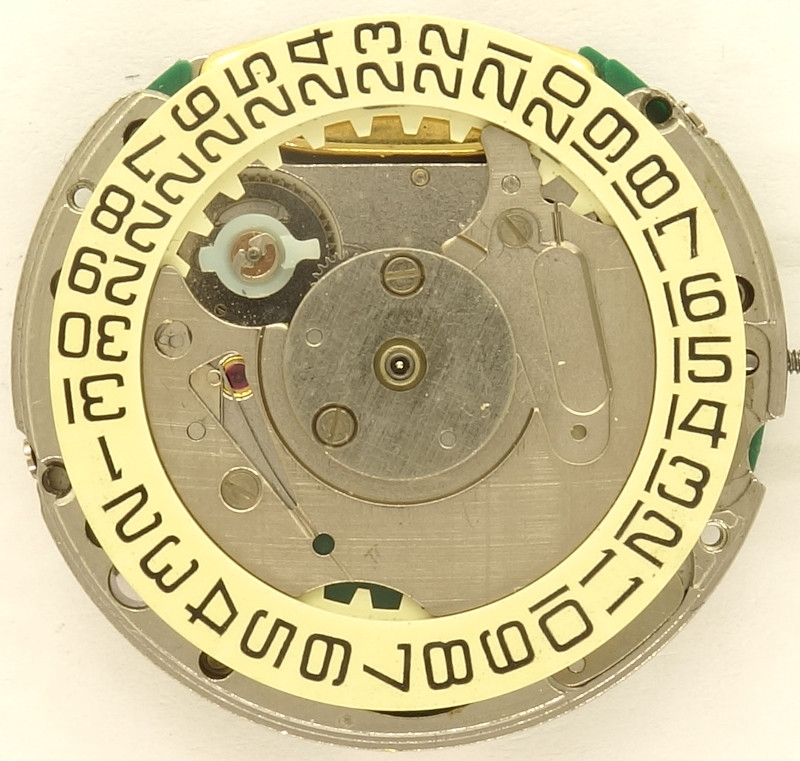 Typical for first generation quartz movements are their large quartz resonators, which here, however, already uses the standard frequency of 32 kHz.