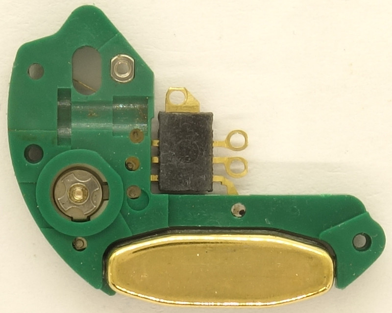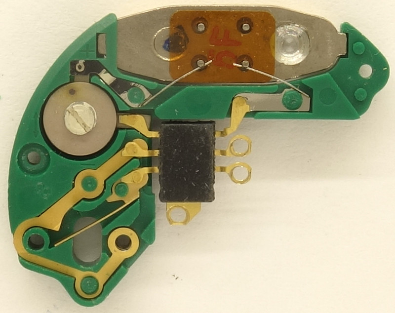 The electronics block with its plastic-riveted traces is a genious construction. And even more genious is the IC, whose connectors can be attached with screws. The two right ones connect with the coil block, the lower one with the positive pole of the battery.