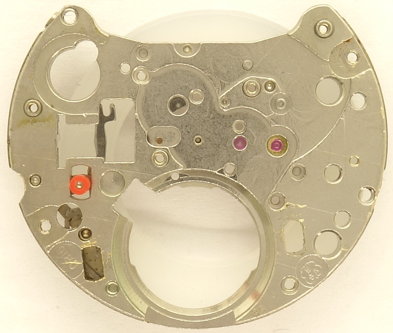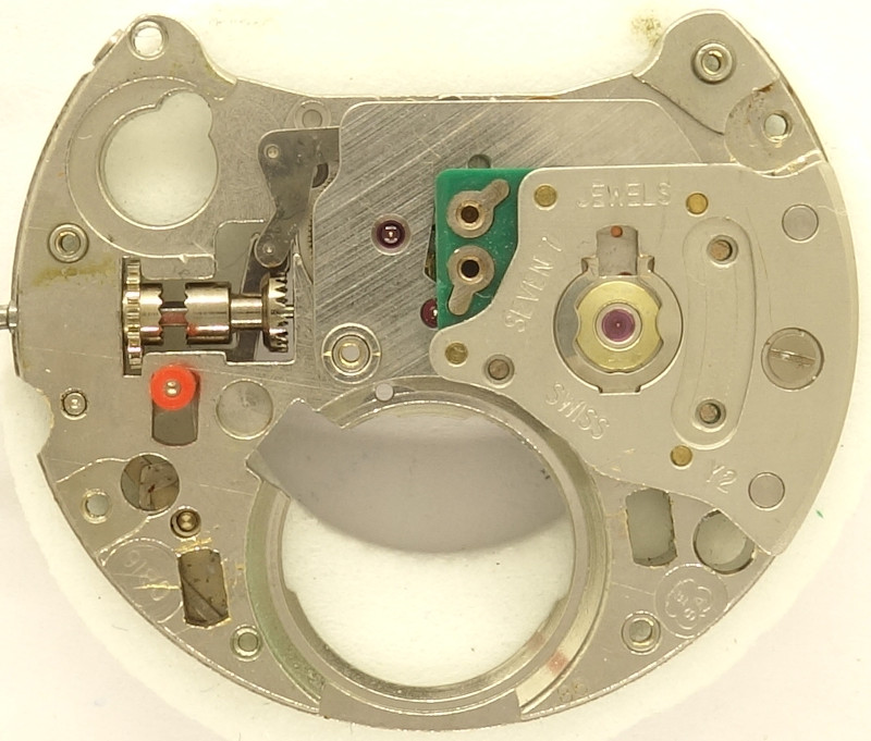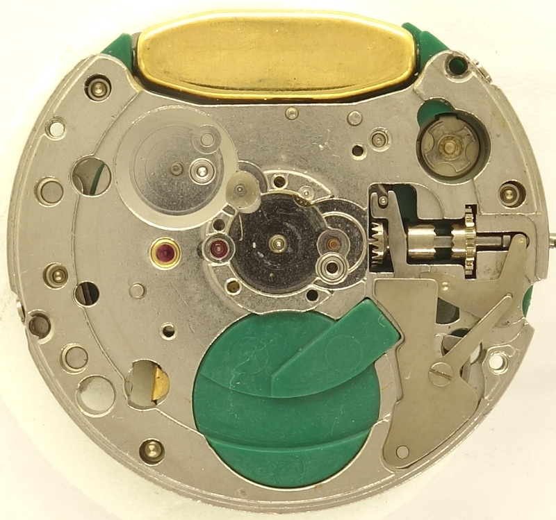 On early quartz movement, is was standard to bear fast turning wheels in ruby, just like on this movement, the rotor wheel (with bearing and cap jewels) and the first transmission wheel.