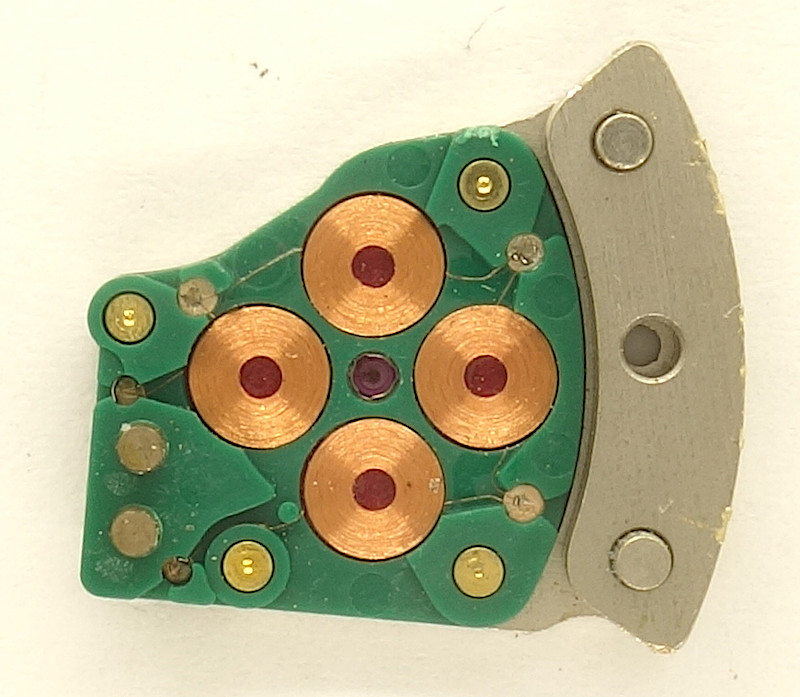 The coil block with its four, plastic mounted coils is very laborious. A modern lavet stepper motor of todays quartz movements with only one coil is trivial against it.